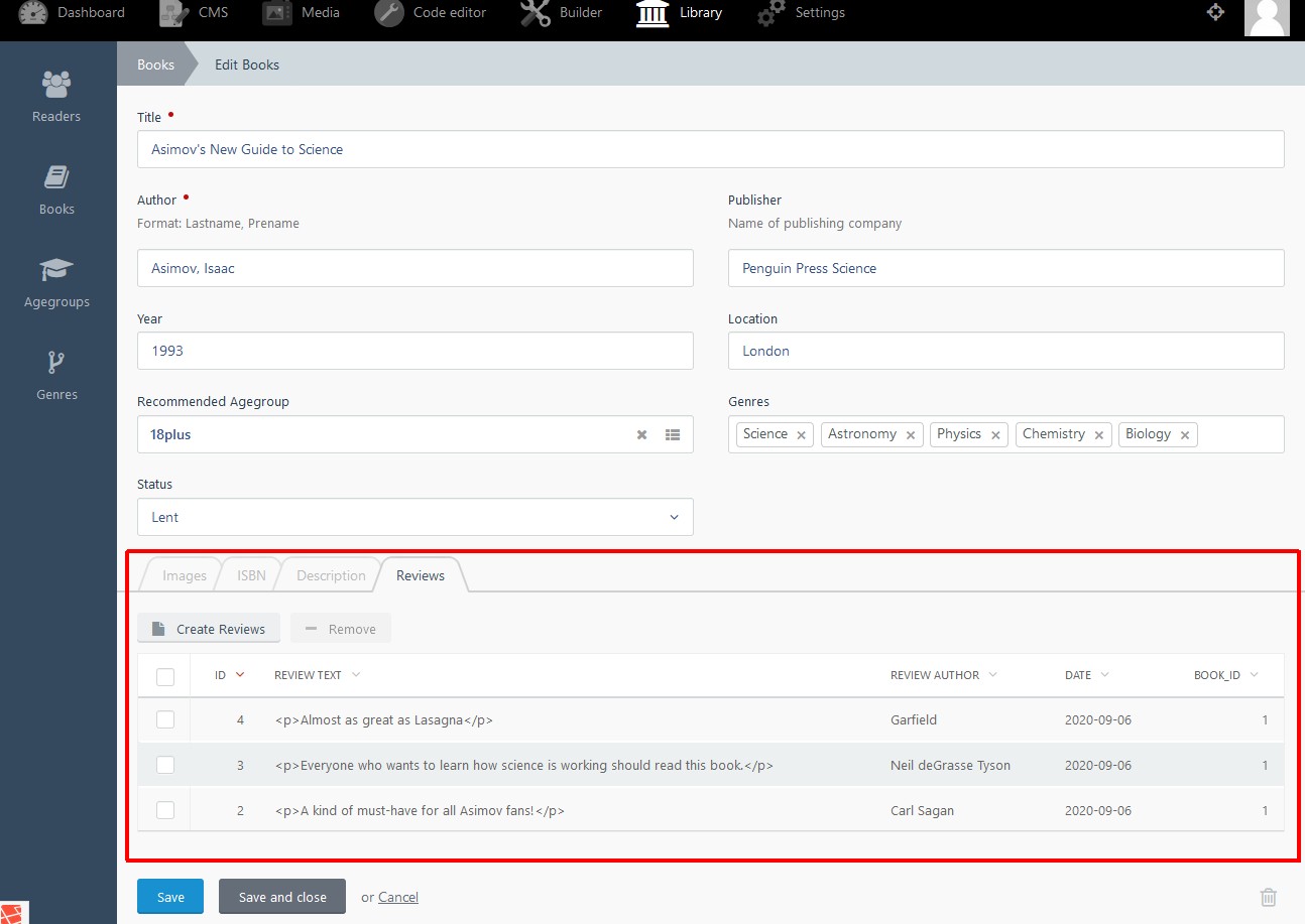 If the name of the key field within the child table (the reviews table in our case) cannot be 'book_id' for what reason ever, we have to define the correct name of the id field. E.g. like this: