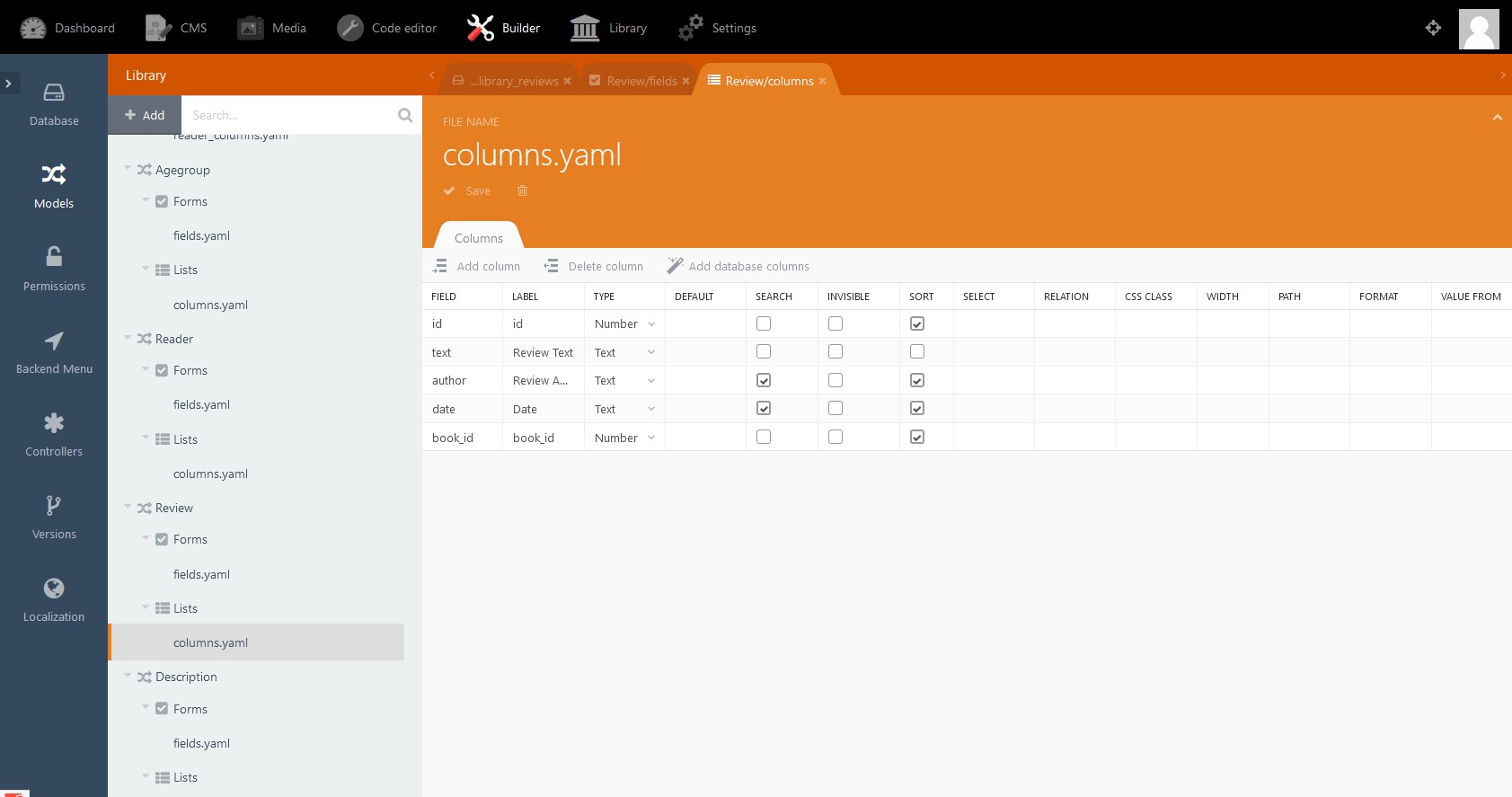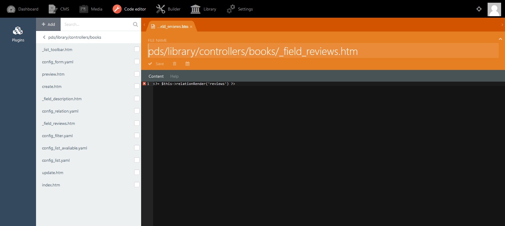 The field name we have to refer to is review as defined before. The partial to display is the one defined in step 6: $/pds/library/controllers/books/_field_reviews.htm
