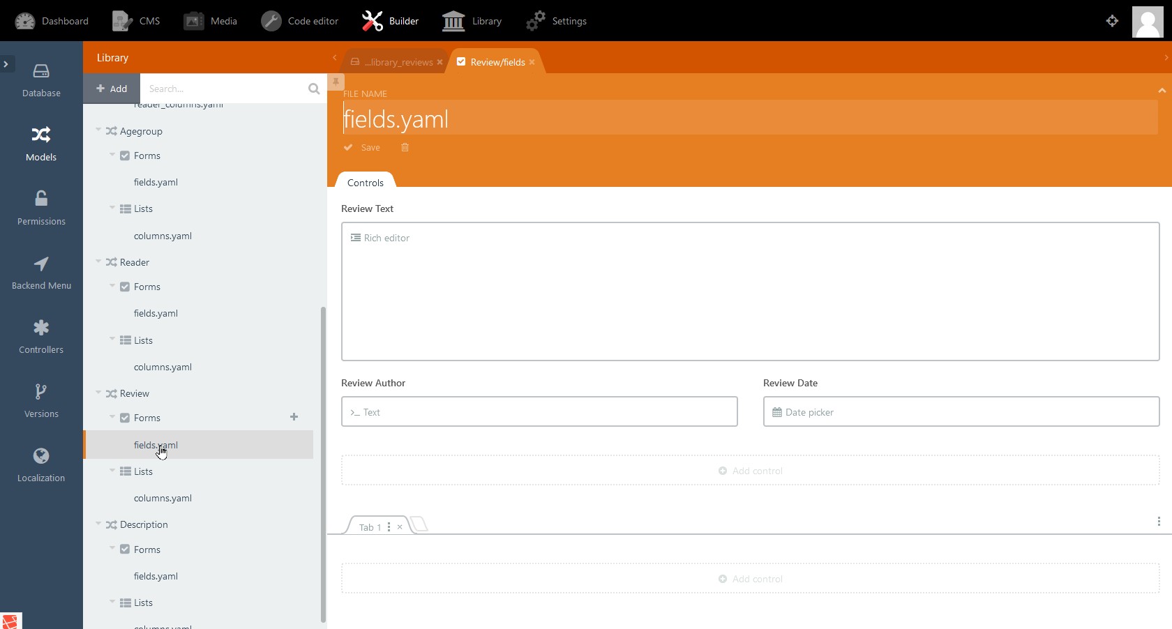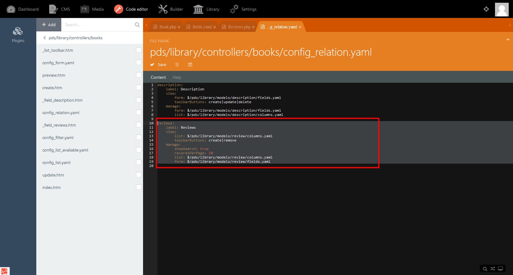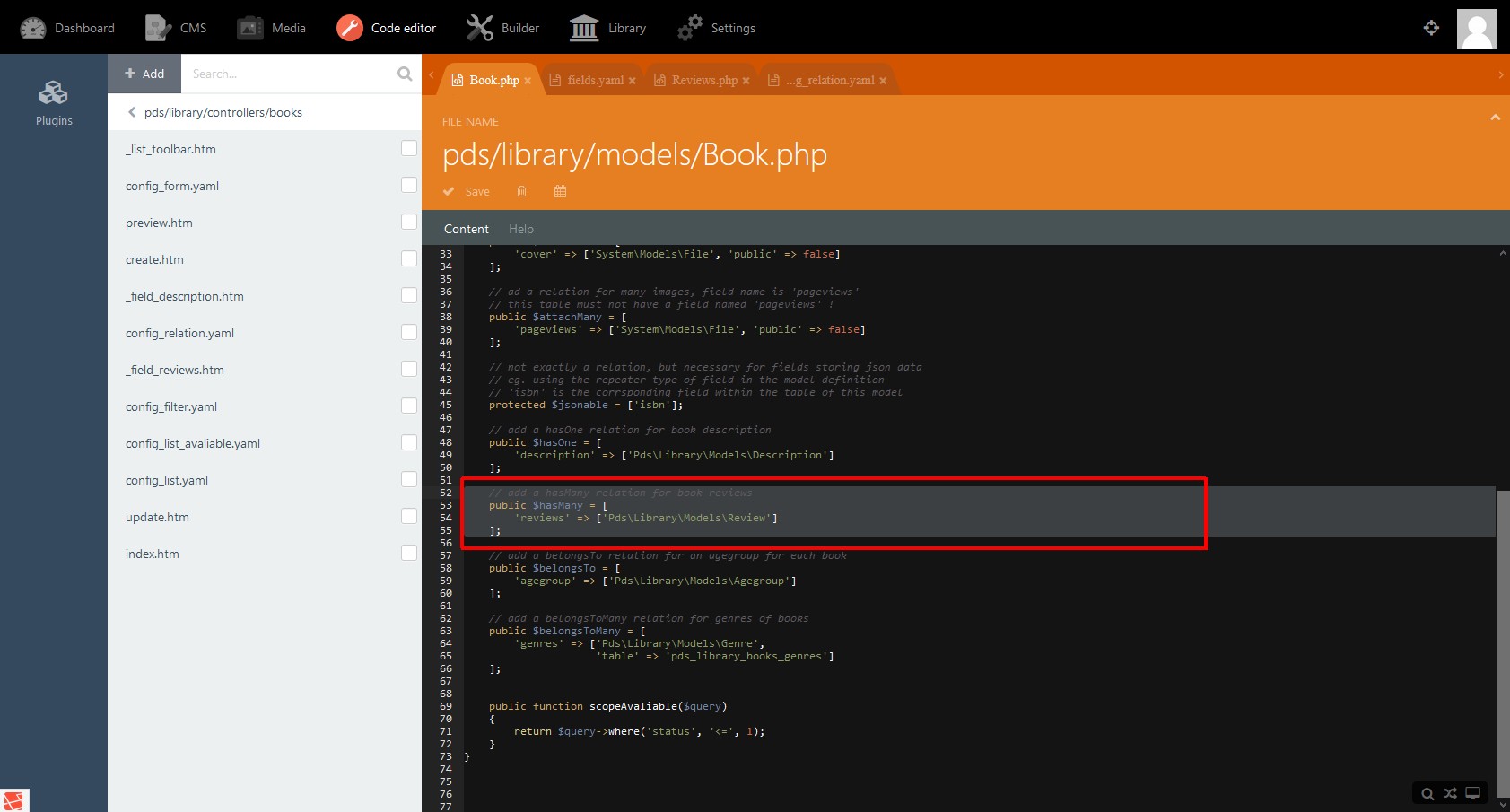 • The root entry reviews is the name we will refer to from the book model (see code: public $hasMany = ['review' ⇒ ['Pds\Library\Models\…' ) .