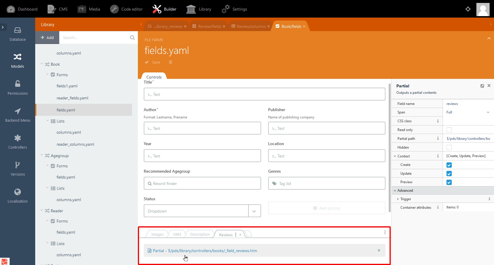 The field name we have to refer to is review as defined before. The partial to display is the one defined in step 6: $/pds/library/controllers/books/_field_reviews.htm