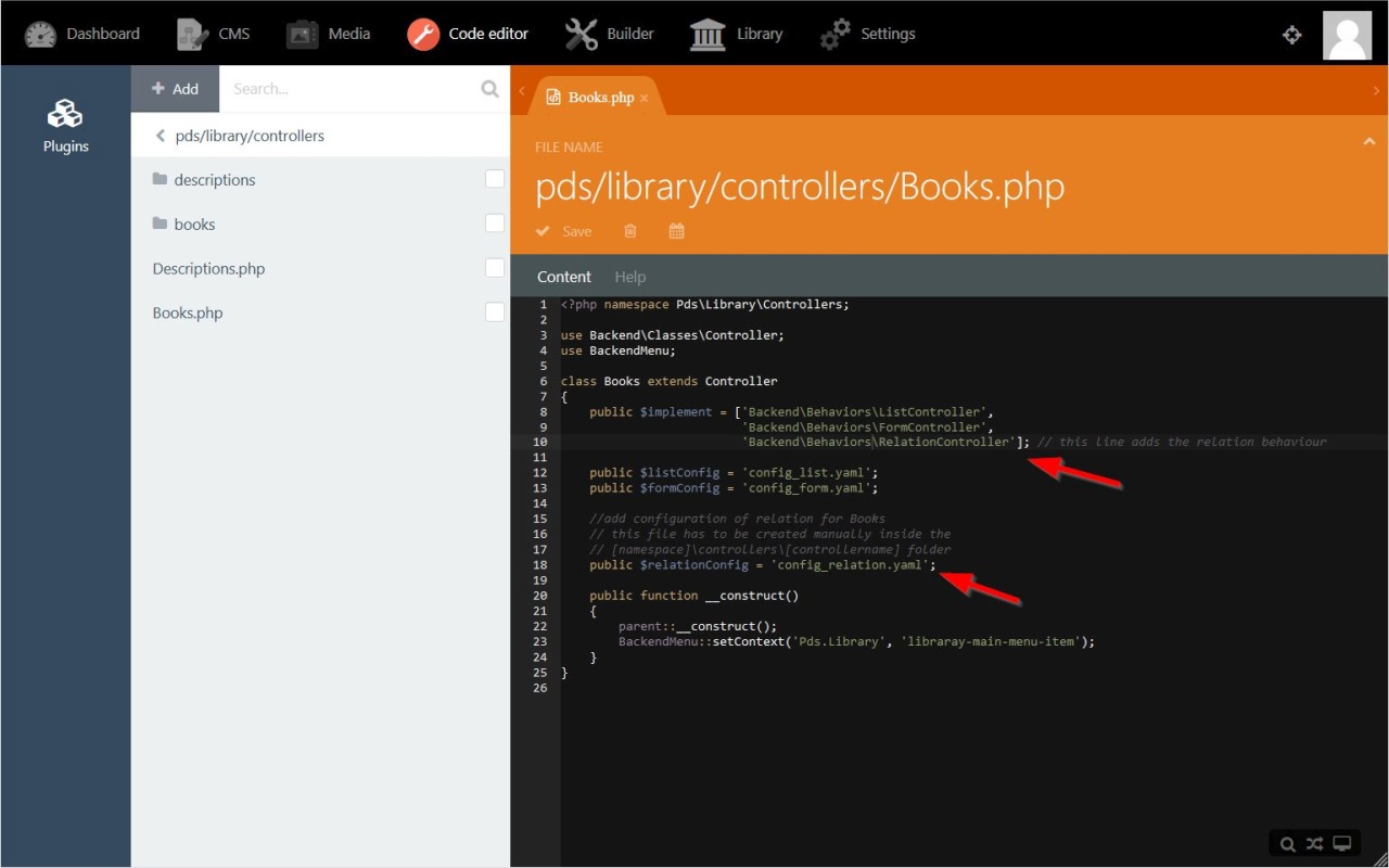 'Backend\Behaviors\RelationController']; // this line adds the relation behaviour
