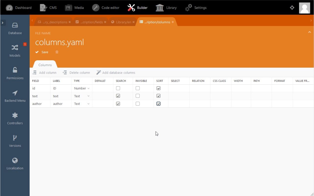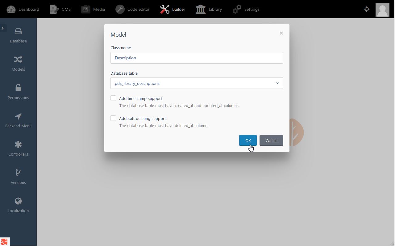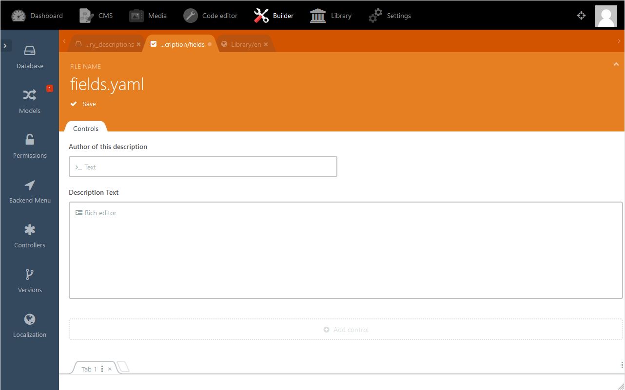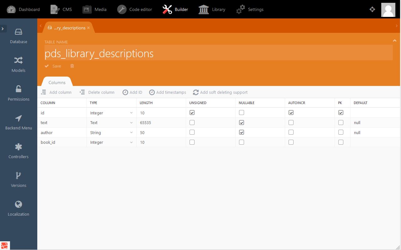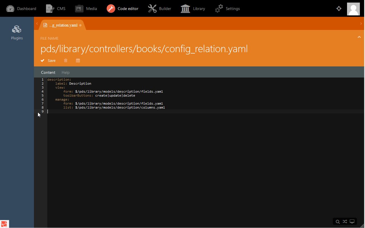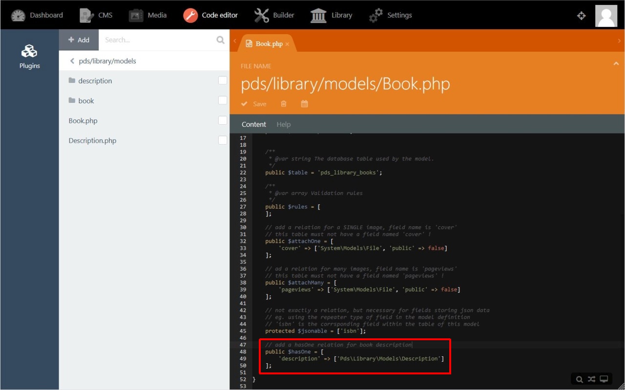 - The root entry description is the name we will refer to from the book model (see code: public $hasOne = ['description' ⇒ ['Pds\Library\Models\…' ) .