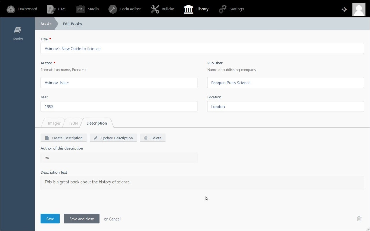 This is what a record with an related record will look like in the example by adding a description to a book. In this example the related form was added into an extra tab on the book form with the options to create a new description, to edit or delete an existing description.