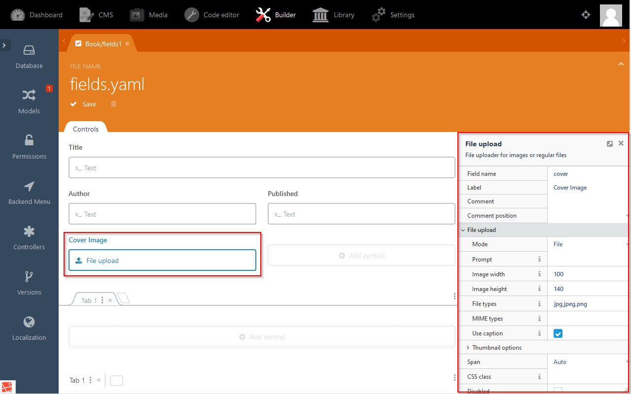 - Add code to model: public $attachOne = ['yourField' ⇒ ['System\Models\File', 'public' ⇒ false]];